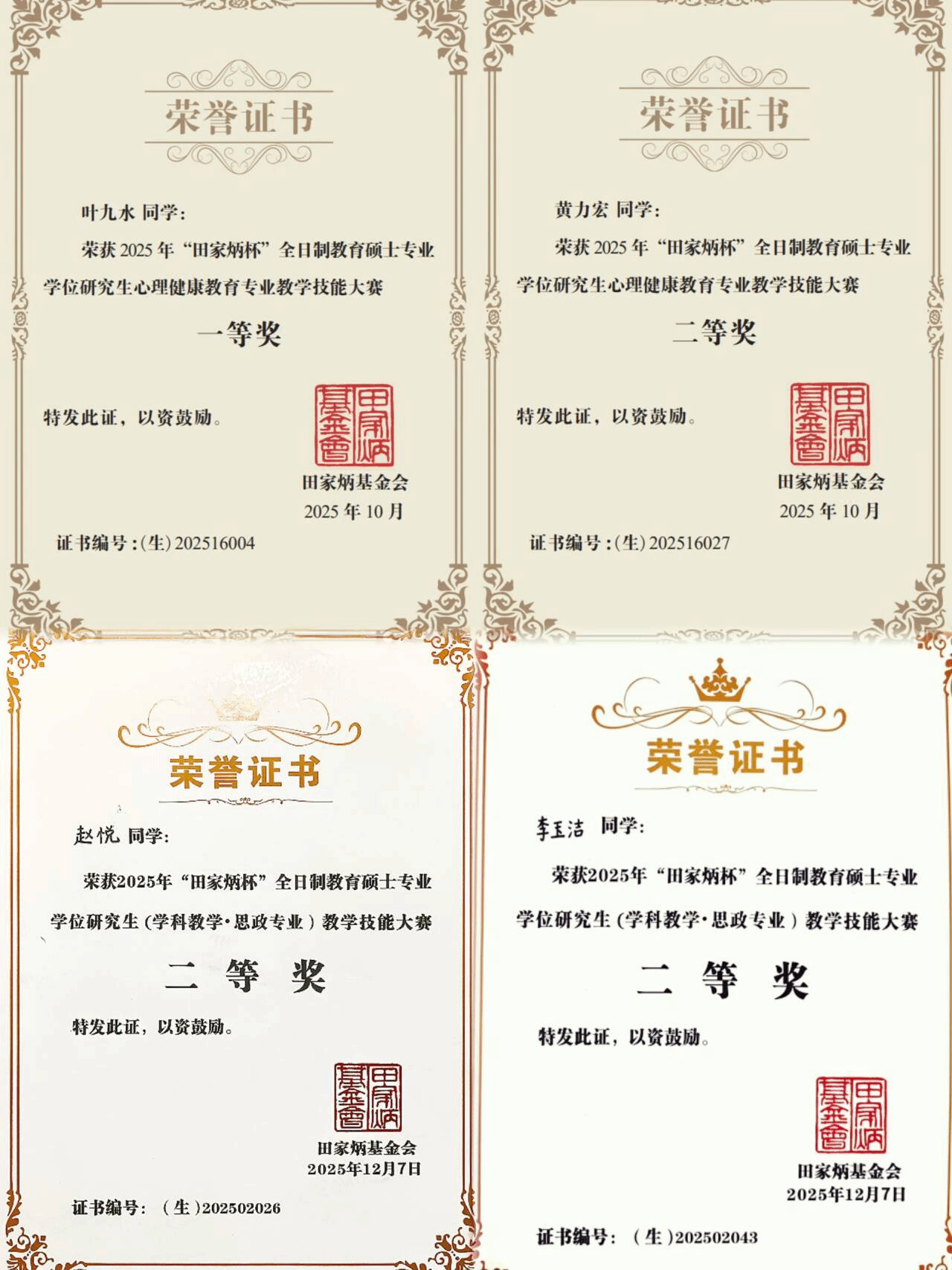 近日,2025年全国“田家炳杯”全日制教育硕士专业学位研究生教学技能大赛各学科方向比赛已圆满落幕。学校选派的多名研究生凭借扎实的专业功底、精湛的教学技能和稳定的现场发挥,在激烈角逐中脱颖而出,斩获佳绩,共荣获一等奖1项、二等奖3项,三等奖6项,优秀教学设计奖4项,姚琼、陈庆华、何光辉、刘英4位老师荣获“优秀指导教师”称号,获奖数量与等级较上一年度实现稳步提升,充分彰显了学校教育硕士培养的高质量可持续发展水平和研究生的卓越风采。